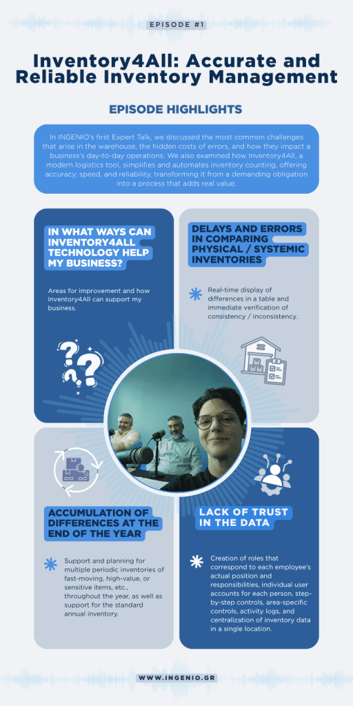Eftychia Athanasiou, joined by guests Antonis Mathioulakis and Aldo Mar, examines the most common challenges and the hidden costs of errors in the warehouse, and demonstrates how Inventory4All simplifies and automates these processes.
